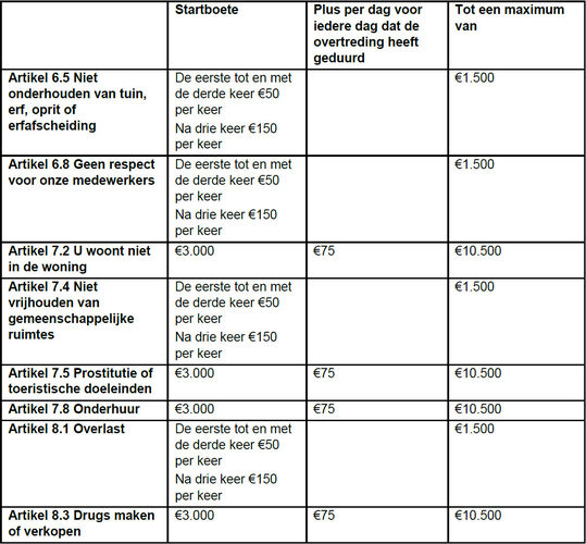 De hoogtes van de boetes zijn van 2023. Deze boetes kunnen jaarlijks op 1 juli (en vanaf 1 juli 2024) maximaal verhoogd worden met het percentage van de inflatie gemeten door CBS (Centraal Bureau voor de Statistiek) van het jaar daarvoor. Deze verhoging zal nooit boven het percentage van huurverhoging huursomstijging van het lopende jaar (zoals aangegeven in de jaarlijkse circulaire) uitkomen.